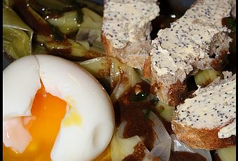 Nous avons préparé le beurre de pavot: du beurre salé et des graines de pavot ou pour nous (de la margarine, du sel et du pavot) et réalisé des mouillettes ensuite.
