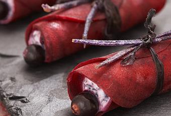 Rouleaux de la terre (betterave et pomme de terre vitelotte), farce de la mer (nori, dulse) acidulée au cassis.