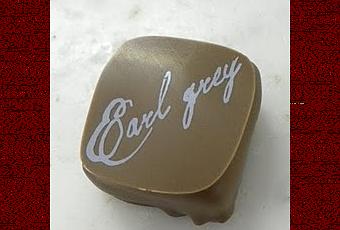 Ici, il s'agit d'une ganache enrobée de chocolat au lait sur laquelle on a posé une décalco...Comme vous l'avez sans doute deviné, ma ganache est cette fois-ci aromatisée au thé Earl Grey. La recette est quasi la même que celle-ci sauf qu'ici, on laisse infuser le thé dans la crème fraîche durant quelques minutes. La ganache est ensuite coulée dans un cadre (comme je l'avais déjà illustré ici) puis une fois prise, on la découpe en carrés. On enrobe ensuite la ganache dans du chocolat au lait à l'aide d'une fourchette de chocolatier...