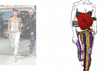 New post of the week. The sublime Rihanna. As the muse of the day, I wanted to him to one pants that « flash ». As already with Demie Moore on the red carpet for Oscar. But I must confess that I am not happy with what I provided for him to put on top, hence the rose(flower) lol. In the end, I like this side « surreal » … .