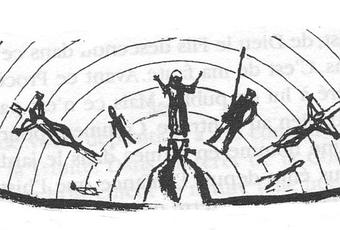 Veuillez regarder notre Schéma. Ces petites troisièmes personnes debouts, pourvues d'une tête, d'épaules étroites et de petits bras, sont toutes nées et vont toutes mourir. Cette grande Première Personne qui est à l'envers, sans tête, avec de larges épaules et des bras immenses n'est jamais née et ne mourra jamais. En termes crus, sa taille et sa forme sont tellement hors normes qu'aucune sage-femme ni aucun entrepreneur de pompes funèbres ne pourraient la manipuler. Il est le Christ Eternel, né du Père avant le monde, réellement Dieu, Lumière des Lumières,et pourtant il renaît toujours, dans toutes les créatures, en tant que Christ crucifié.