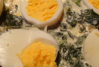 Dans un plat à four, déposer les oeufs coupés en deux, recouvrir d'épinards crémés et saupoudrer de chapelure et de fromage. Passer sous le grill quelques minutes et déguster.