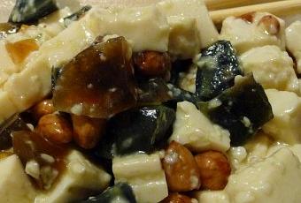 Le restaurant n'étant pas équipé de chauffage (la Chine en hiver est un challenge), je me décide pour la version " à l'emporter ". Arrivée dans ma chambre, pas trop mal chauffée..., je découvre à étonnement mon plat de résistance qui est en fait une salade de tofu aux œufs de cent ans et cacahuètes.