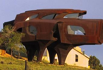 De temps en temps, j’aime bien vous présenter une maison extravagante, iconoclaste ou simplement hors norme. C’était le cas avec la maison en forme de coquillage conçue par Octavio Ocampo dans la mer des Caraïbes. Je vous présente aujourd’hui une maison extraordinaire qui répond moins d’une approche organique que d’une approche mécanique de l’architecture : Steel House (maison de fer) de l’artiste Robert Bruno, située près de la ville de Lubbock au Texas. La maison n’est pas encore terminée mais elle parle déjà suffisamment d’elle-même. L’architecture très spectaculaire flirte ici avec le mouvement sculptural cubiste. Mais je lui trouve aussi un côté Jules Verne, sa carcasse en métal brut évoque une science fiction d’un autre temps, surtout à l’intérieur avec ses volutes de fer, où on a un peu l’impression d’entrer dans un sous-marin rétro-futuriste, tel le capitaine Nemo dans l’antre du Nautilus. La maison est une véritable caverne de fer et on comprend pourquoi le sculpteur a mis 23 ans pour la construire. Imaginez un peu le travail de soudure des innombrables plaques qui composent la maison : 110 tonnes d’acier au total ! Pourtant, au prix de la matière première, la maison de vaut que 25 000 euros, moins chère qu’une belle berline !