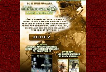 Ok, peut-être pas autant… Néanmoins, il vous sera proposé pas moins de 5 packs Xbox 360 super elite édition limitée Modern Warfare 2 auxquels sont ajoutés des pack Stimulus. Les 10 gagnants suivants remporteront un jeu Modern Warfare 2 et un pack Stimulus.