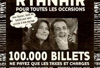 En France, à l’annonce du mariage de Nicolas Sarkozy, Ryanair s’est empressé de lancer une publicité cheap (en noir et blanc) mais fun qui a fait mouche et a été reprise par tous les médias.