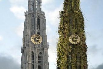 Si vous n’êtes pas allé à Anvers, vous ne savez peut-être pas que sa cathédrale est restée inachevée. Quand ils ont commencé à la construire au 14ème siècle, ils n’avaient pas prévu qu’ils seraient à court de finances. Faute d’argent, la ville a été forcée de stopper les travaux, laissant l’éventuelle poursuite du chantier aux générations suivantes. Sept siècles plus tard, la potentialité pourrait se transformer en actualité, car la ville vient de lancer un concours intitulé Designing the Absent pour finir la cathédrale. Chaque concurrent est libre de présenter un projet, dans le cadre d’un vaste brain-storming. Aucune contrainte n’est imposée. Le projet n’a pas besoin d’être fonctionnel, et le travail rendu peut prendre n’importe quelle forme : une planche en papier, une maquette en 3D, un collage, une vidéo… Le concurrent doit juste accompagner son projet d’une courte explication du concept. Je vous présente ici le projet « vert » de Tim Hobbelman et Chris Idema qui consiste à enrober la tour manquante d’un habit de verdure. Le projet n’a pas qu’un intérêt esthétique, sa vocation est aussi d’être auto-suffisant : le projet prévoit son propre approvisionnement en eau pour irriguer la végétation de la façade. L’eau de pluie qui tombe sur la tour est recueillie à la base pour être ensuite redistribuée grâce à un système d’arrosage desservant toute la tour. Le système d’arrosage est finalement alimenté par l’énergie solaire grâce à des cellules de silicium installées sur les fenêtres de la tour. La végétation devrait créer un véritable petit écosystème offrant un habitat de choix pour les oiseaux, les insectes ou d’autres espèces.