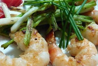 Samedi, délicieuses crevettes au saké, accompagnées de ciboules (ou de petits oignons nouveaux) et de tomates cerise. C'était vraiment savoureux et simple et rapide à préparer. Les crevettes (de très bonnes grosses crevettes de notre fournisseur de surgelés préféré !) marinent quelques minutes dans une sauce au saké puis cuisent très rapidement au gril. Il faut bien veiller à ne pas les cuire trop (environ 2 minutes de chaque côté).