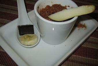 -4 petites bananes-2 petites poires bien mûres-125 gr de spéculoos-75 gr de poudre d'amandes-100 gr de beurre doux froid-100 gr de cassonade-6 carrés de chocolat