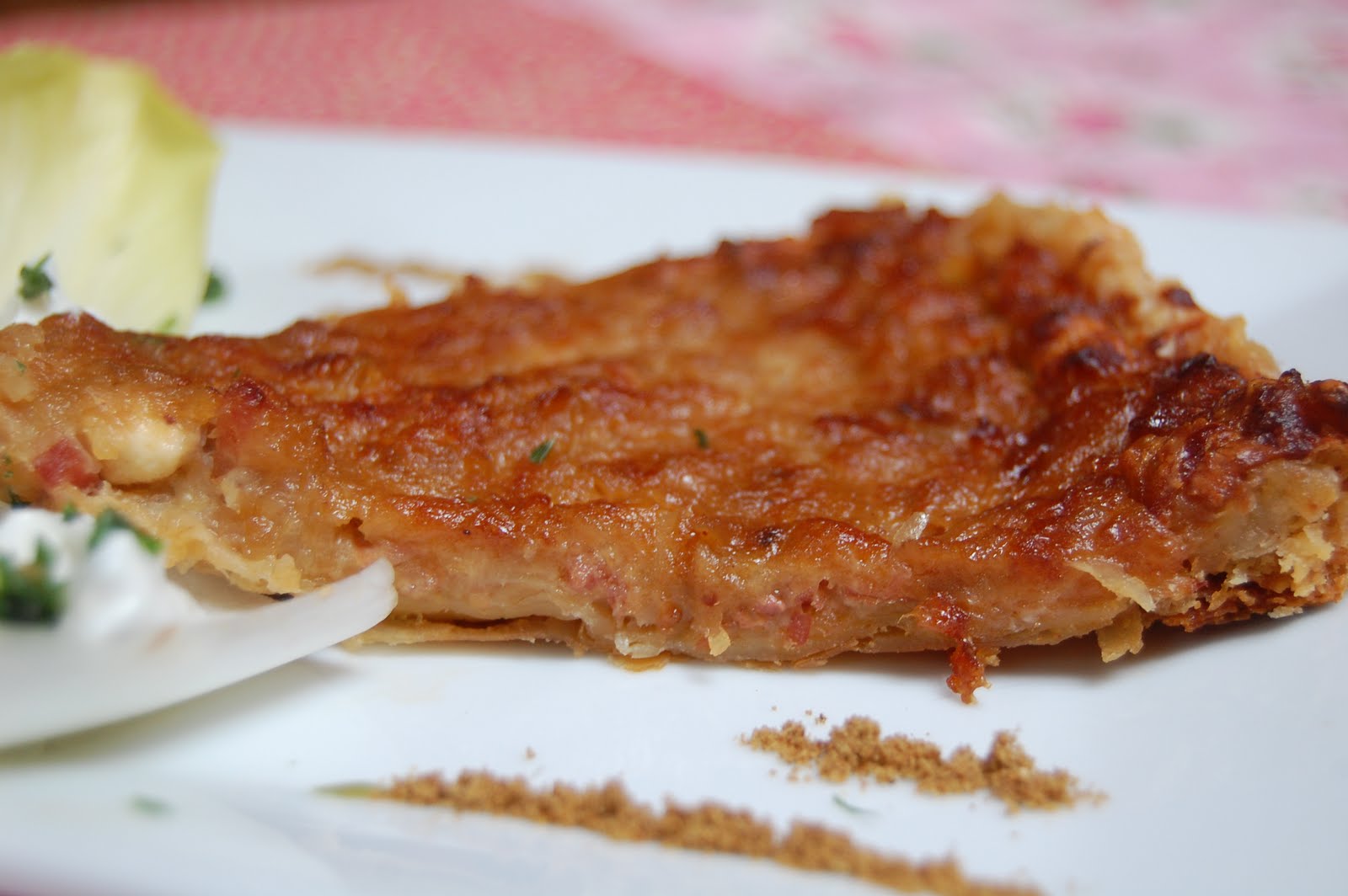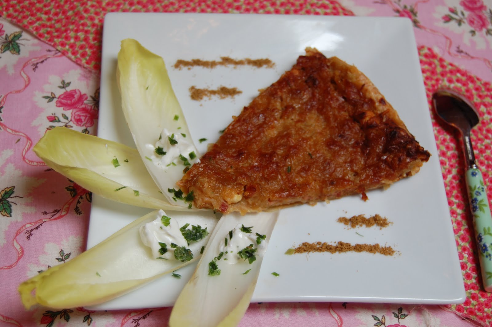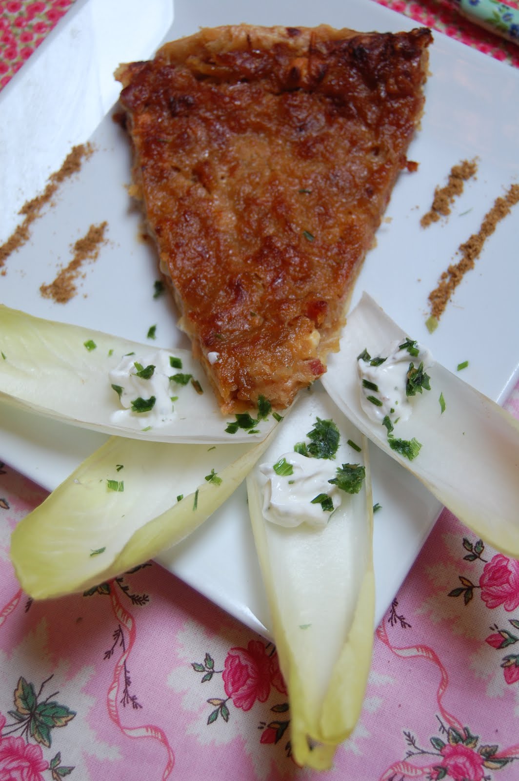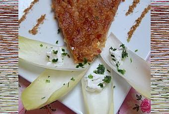 Ici, j'ai installé des feuilles d'endive avec une petite crème: petit suisse nature + ciboulette +épice"saveur du sud". L'épice sur le bord de l'assiette, c'est du cumin, cela se marie bien avec cette tarte.