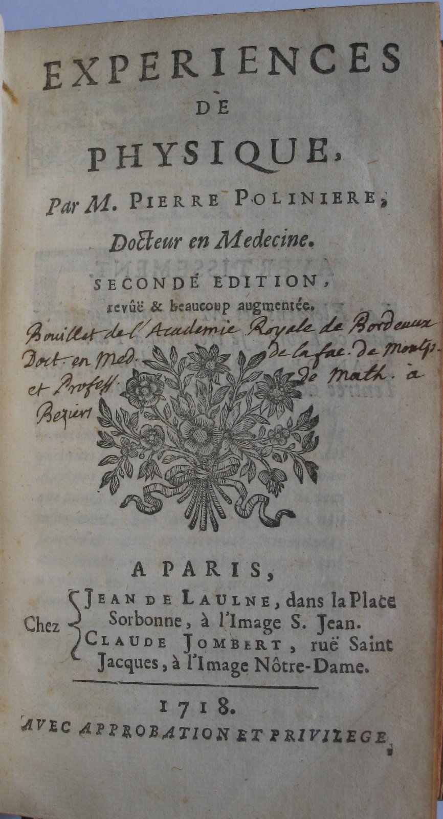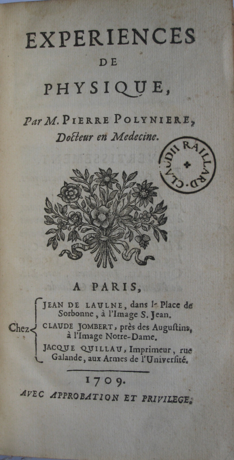 Il s’agit d’un ouvrage de Pierre Polinière (1671-1734), médecin, mathématicien et physicien, considéré comme le fondateur de la physique expérimentale en France. A Paris, il est l'élève de Pierre Varignon (1654 - 1722) , qui enseigne les mathématiques au collège Mazarin. Précurseur de Nollet, Polinière ouvre un cours de physique au collège d’Harcourt, l'un des premiers cours publics donnés à Paris, bien avant ceux de l'abbé Nollet. Ses expériences sont très populaires et, parmi les spectateurs, on trouve les « gens du monde », le Régent et le Roi lui-même. Ce cours est publié en 1709.