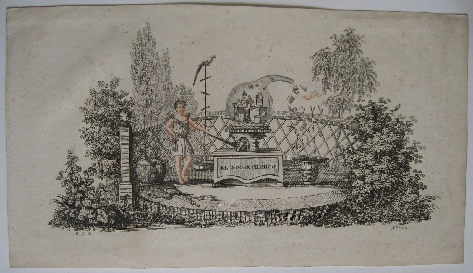 Addenda qui n’a rien à voir : Parmi les lecteurs du blog, qui peut me renseigner sur cette étonnante gravure, « EL AMORE CHIMICO » ? En bas : B.L.D. et N° 1152.