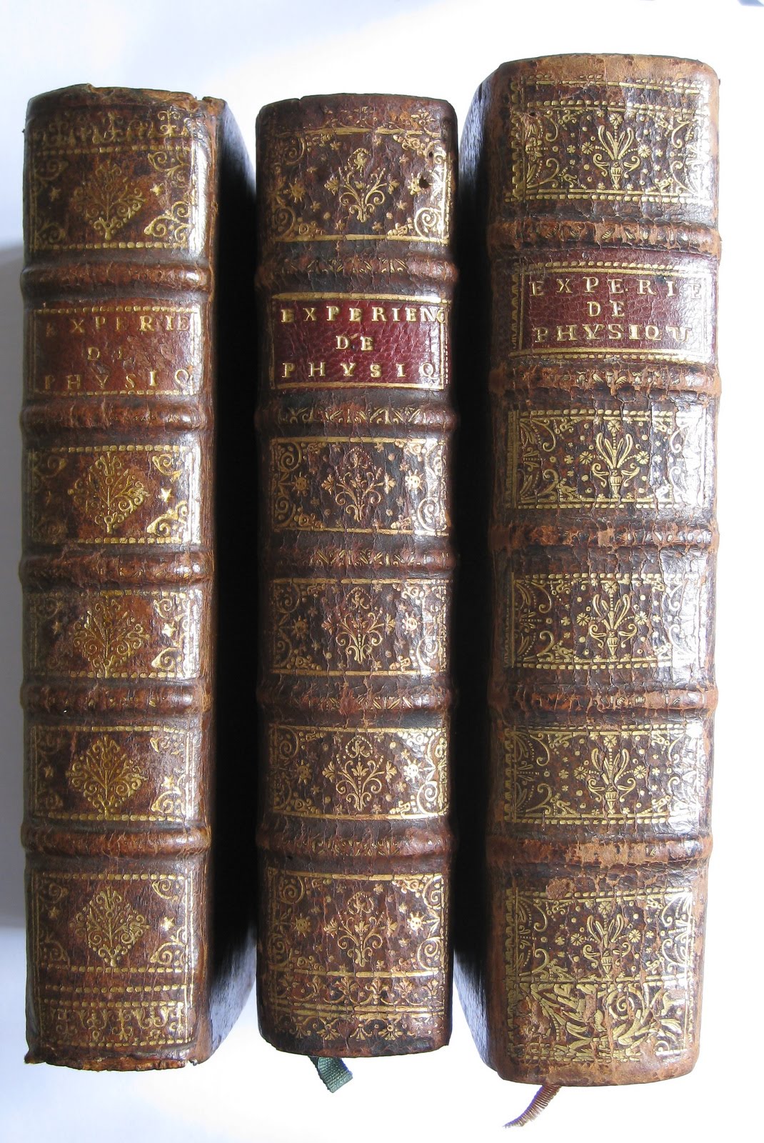 Expériences de physique. Paris, J. de Laulne, C. Jombert, J. Quillau. 1709.1 volume in-12 ; VIII, 508 pp, 10 pl coloriées d’époque.Cette première édition décrit 100 expériences : Expériences de méchanique sur l’équilibre des liqueurs – Expériences sur la pesanteur de l’air seulement – Expériences sur le ressort de l’air seulement – Expériences sur le ressort et sur la pesanteur de l’air en même temps – Continuation des expériences sur le ressort et sur la pesanteur de l’air – Expérienes sur l’acoustique – Expériences de l’aiman – Expériences de chymie – Expériences anatomiques – Expériences sur les couleurs et sur la lumière. L’auteur observe, dans certains liquides biologiques, des « petits animaux qu’on ne voit qu’au microscope …qu’il y en a de mal-faisans d’où viennent les maladies … ».