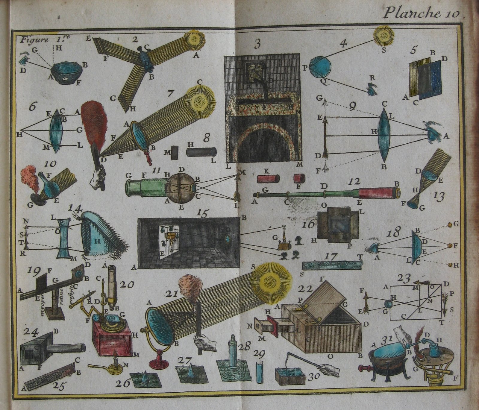 Cette édition décrit 107 expériences. La planche 16 est doublée avec quelques différences. Ex-libris de Bouillet de l’Académie de Bordeaux.