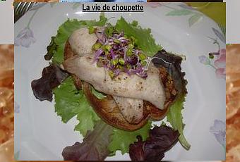 3/ Au moment de passez à table, préchauffez le grill du four. Garnissez chaque tartine de pain avec des légumes, puis déposez les filets de poisson et glissez pendant 3 ou 4 min sous le grill. Servez ces crostini sur la salade verte décorée de pétales de capucine.