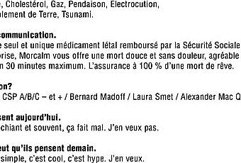 Ce brief de la Mort qui Tue, si vous l'acceptez, donnera lieu à une création de votre part, en double-page A3 qui sera jugée par un des plus grands directeurs de création à cheveux gris de tous les temps de l'histoire du monde de la publicité (un peu de pommade ne nuit pas en ces temps de vache maigre). Si vous êtes les élus, vous aurez droit à la double page centrale (avec vos noms) de la première mouture de PopCorn, splendide Manganzine, croisement contre-nature entre un magazine et un fanzine, qui sera distribué dans les plus grandes agences parisiennes de publicité à près de 5000 exemplaires, tout de même, c'est pas de crotte puisque c'est PopCorn. Si c'est pas la gloire, ça. Si c'est pas une bonne manière de faire parler de soi, ça. Si c'est pas mortel, ça.