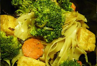 - A mi-cuisson, ajouter les morceaux de tofu frits. Puis incorporer les nouilles. Les faire sauter 5 minutes en mélangeant régulièrement.