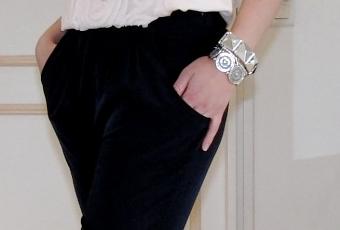 et oui c'est la 1ère fois que vous me voyez en pantalon!!! parce que les pantalons c'est pas mon truc...déjà avant que j'en trouve un à ma taille voilà le parcours du combattant et du coup ca me fatigue avant et je retourne à mes éternels jeans!!!et puis en plus je suis difficile je ne veux pas de pantalon trop habillé (sinon quand je les mets?) ni qui se froisse trop (je ne sais pas repasser ahem) et en plus niveau couleur je suis carrément chiante: j'aime le marine ou le gris foncé et c'est tout!seulement cette fois ci c'est différent, je cherchais une robe pour un baptême mais rien ne convenait parce qu'elles étaient soit trop chaudes, soit trop de froufrous bref rien de beau... du coup pas le choix pour avoir quelques chose de mettable il me fallait un pantalon...et franchement j'ai cru faire une dépression... je dois être vraiment mal fichue mais ils sont tous immenses à la taille ou alors trop longs (genre faut mesurer 2m) ou encore je n'y rentre pas mes mollets (mais sérieux z'ont quoi mes mollets???).Après avoir écumé tous les pantalons du suédois et autres, l'espagnol m'a sauvé la mise une fois de plus! je suis enfin tombée sur THE pantalon fait pour moi: taille élastiquée et zip aux mollets alors moi je dis vive Zara!donc me voilà avec un petit pantalon marine avec une coupe bien sympa pour la modique somme de 25€ que demandez de plus... qu'il se repasse tout seul? ouais non ok j'arrête...