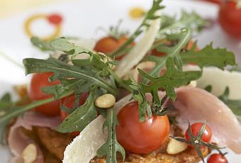 Faire cuire le blé selon les indications du paquet mais ajouter le coulis de tomate avec 20 cl d’eau à la place des 30 cl d’eau. Pendant ce temps, râper le parmesan, détailler la mozzarella en cubes. Ajouter les fromages dès que le blé est cuit et bien mélanger. Former les pizzetta sur une SILPAT® ou une feuille de cuisson, en tassant le blé dans des cercles à pâtisserie. Faire sécher au four préchauffé à 175°C pendant environ 20 mn. Mélanger le vinaigre avec 3 c. à s. d’huile d’olive. À la sortie du four, répartir les tomates cerises, la roquette. Verser ou vaporiser la vinaigrette. Ajouter le jambon, les pignons grillés à secs et des copeaux de parmesan. Servir immédiatement.