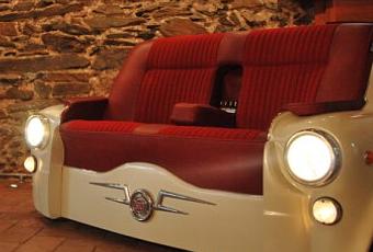 Après la Vespa Chair du studio Bel&Bel, je vous avais promis d’autres perles dans le genre recyclage vintage. Eh bien voici le « canapé SEAT 600″ du même studio. Comme son nom l’indique, le canapé est fabriqué à partir de la carrosserie avant de la SEAT classique espagnole, le dossier et l’assise sont constitués de matériau recyclé. Le canapé intègre un mini-bar caché à l’arrière du canapé des haut-parleurs de 160 watts, une prise pour iPod, ainsi que… des phares et des clignotants. Logique non ?