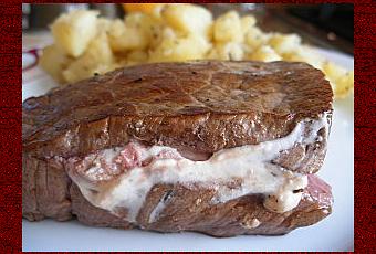 2) Ouvrez vos pavés de boeuf dans l'épaisseur, en portefeuille (sans couper jusqu'au bout). Tartinez de mélange au chèvre et refermez.