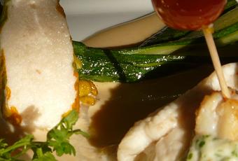 Sole entière désarêtée, garnie de farce mousseline de poisson, servie avec une sauce vin blanc. La garniture est une courgette fleur dont la fleur est farcie de farce mousseline.