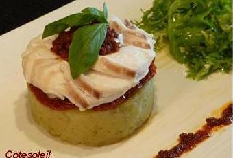 Et maintenant, à l’aide d’un cercle à pâtissier, superposez la purée, 2 à 3 tranches de tomates séchées (selon le diamètre de votre cercle) puis le cabillaud joliment et délicatement effeuillé en éventail.