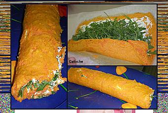 Disposer sur deux moitiés fromage et roquette (pas beaucoup), recouvrir de la troisième moitié de génoise et découper des petits carrés. Vous obtenez des mini sandwiches. Décorer le dessus d'une rondelle fine de carotte .