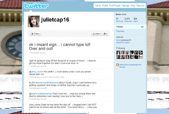 Charlotte Wakefield, l'actrice de 16 ans, qui incarne Juliette, avancerait sous le pseudo julietcap16. Avec les cinq autres acteurs, elle diffusera ses messages en 140 caractères. Petit extrait : http://twitter.com/julietcap16