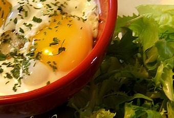champignons sautés dans les ramequins. Casser et déposer un œuf par ramequin, enfourner à four moyen (180°) pendant 5 minutes, le four étant préchauffé. Ajouter la crème fraîche et cuire encore 2
