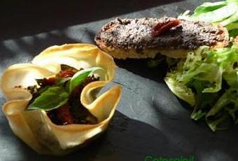 Poussant le vice à l’extrème, j’ai présenté cette entrée avec des mouillettes de tapenade (j’adore ça !!!) et une salade bien croquante.