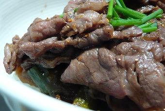 En fait, on ne mange pas très souvent du boeuf, donc, quand on en mange, autant qu'il soit très bon. Et il y en avait une toute petite quantité, de quoi le savourer lentement ! La viande et les légumes avaient cuit séparément dans une sauce sucrée "nikujaga" (dashi/sauce soja/sake/sucre). Un peu de ciboulette sur le bol et place aux baguettes !