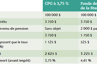 Ce matin, François Provost m’a rendu visite et m’a fait une démonstration qui m’a vraiment étonné. En achetant une CPG à la banque ou à la caisse du coin, on sait déjà que les intérêts seront pleinement imposables, mais si vous souscrivez plutôt à des produits de dépôts auprès d’un assureur, ils deviennent admissibles à un crédit pour revenu de pension de 2000$ par année. Ce n’est pas négligeable!
