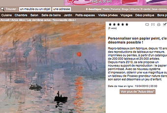 Voici un premier article paru dans la presse en ligne à propos de notre nouveau support de reproduction, la papier peint intissé. Ca fait plaisir et je remercie la rédactrice web de Marie-Claire Maison, Béatrice Remond. J'espère que c'est le début d'une longue série, les communiqués sont expédiés à divers journalistes.