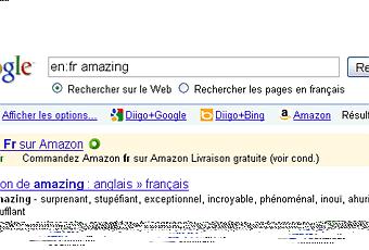 Pour obtenir la traduction en français du terme anglais « amazing » il suffit d’inscrire « en:fr amazing » dans le formulaire de recherche