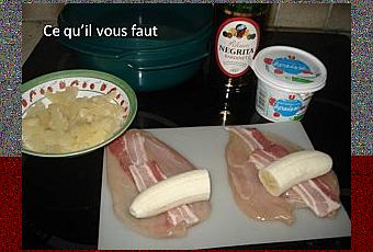. Salez bien, poivrez l’intérieur des escalopes et enroulez-les autour des ½ bananes et d’une tranche de lard. Maintenez avec un pique olive.