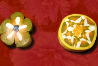 Celle de droite je l'ai faite avec des restes d'hier (les bords de canes aux motifs trop déformés). Et je me suis essayée à faire une fleur sans combler les vides entre les pétales, houlala ce que c'est dur de découper sans trop déformer! Je mets pourtant la cane au congélateur pendant un quart d'heure pour qu'elle soit plus dure mais ça se déforme quand même un peu. Le découpage vous le faites avec un kutter ou il y a un outil spécial pour la pâte polymère?