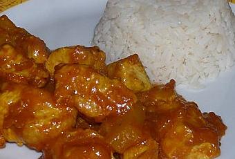Faire chauffer l'huile dans une sauteuse et y faire dorer le poulet. Une fois le poulet bien doré, ajouter la préparation ail/oignons/pomme. Cuire environ 5 minutes.