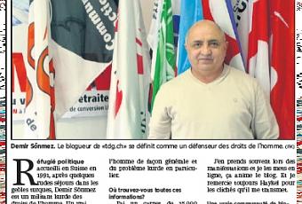 Aujourd’hui dans La Tribune de Genève dans la page des blogs une petite interview consacrée à mon ami Demir Sönmez. Un militant de la première heure. Ces dernières années il n’y a pas une seule manifestation de gauche à Genève où je ne l’ai pas vu. Il répond toujours présent. Il est là aussi bien pour les petites que pour les grandes causes. Demir n’aime pas qu’on parle de lui. C’est un timide qui se soigne par l’engagement total qu’il porte à la ville de Genève qui l’a accueilli depuis 19 ans. Son crédo c’est les autres. Il préfère attirer l’attention sur les opprimés, ceux qui font l’objet de privation de liberté, de l’injustice du patronat ou du terrorisme d’Etat. Je sais qu’il n’osera pas écrire sur lui-même c’est pourquoi je me permets par solidarité entre blogueurs de le mettre modestement sous les feux de la rampe dans PLANETE PHOTOS rendant ainsi hommage à l’homme et à son combat citoyen. Bravo Demir. La lutte continue camarade.