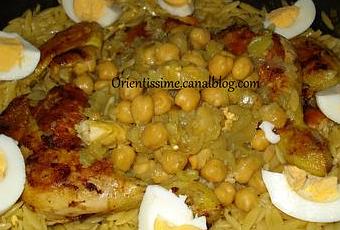 500 g de pâtes "langues d'oiseau" - 4 cuisses de poulet - 1 gros oignon 1 bol de pois chiche trempés la veille - 1 c. à soupe de smen (beurre rance, ou ghee) ou à défaut du beurre doux-sel, poivre, 1 bâton de cannelle, pincées de curcuma ou safran-huile-2 œufs durs.