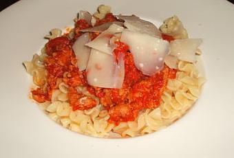 Pendant ce temps, faire cuire dans de l'eau bouillante salée. Servir les pâtes avec la sauce et des copeaux de parmesan.