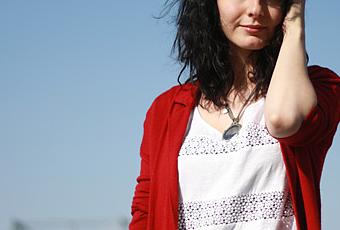 Du rouge, ça faisait longtemps ! D’ailleurs, j’ai une petite collection de robes rouges qu’il faudra que je vous montre un jour… J’aime beaucoup ce cardigan d’un beau rouge éclatant. Il n’a qu’un seul défaut : sa maille s’use bien trop vite (hum, si tu me lis et que tu travailles chez The Kooples, un petit effort sur la qualité, c’est possible ?)