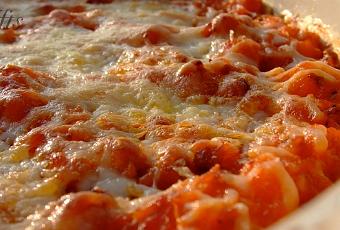 Verser dans un plat à gratin, saupoudrer d'emmental râpé, disposer de petites noisettes de beurre dessus et enfourner pour 30 minutes.