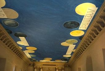 Il s’agit d’un plafond peint pour la salle des bronzes Grecs au premier étage de l’aile Sully sur une superficie de 350 m2. Comme vous pouvez le voir sur la photo, c’est un immense ciel bleu parsemé de ronds jaunes ou noirs « que l’on peut interpréter comme des boucliers, des planètes ou des pièces de monnaie » selon le site du Louvre. Sur les côtés, dans de grands cartouches blancs, apparaissent les noms de grands artistes de la Grèce classique : Praxitèle, Phidias, Myron, Polyclète écrits avec l’alphabet Grec. Ce grand ciel bleu est bien entendu une référence aux paysages de la Grèce antique et aux objets présentés dans la salle. A noter que tout à côté se trouve un autre plafond bleu, « Les oiseaux » de Georges Braque installé dans la salle Henri II en 1953.