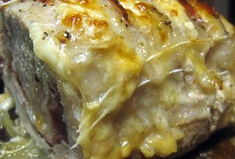 Entre chaque tranche, insérer une tranche de bacon et une de fromage.