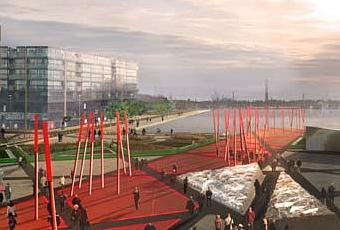 Excuses-nous Ô Stendhal d’avoir repeint ton titre, mais c’est pour parler du nouvel aménagement imaginé par Martha Schwartz à Dublin, le « Grand Canal Square ». Voici une nouvelle requalification urbaine qui n’est pas sans rappeler celle réalisée à Vancouver par le Jill Anholt studio. Un projet dont nous parlions ici. En Irlande comme au Canada, il s’agit de rendre à la ville une zone portuaire délaissée, une friche qui se couvrira bientôt de logements et de bureaux et à pour point d’orgue un théâtre (inauguré en mars dernier) dessiné par Daniel Libeskind. Miam!