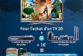 Samsung lance déjà des offres complètes pour plonger au coeur de l’expérience 3D et pour découvrir une qualité d’image exceptionnelle avec la technologie LED. Plonger au coeur de l’expérience 3D Pour vivre pleinement l’expérience 3D et pour redécouvrir le plaisir des soirées cinéma en famille, Samsung propose le premier équipement 3D complet. En effet, du 12 mai au 27 juin 2010, pour l’achat de 2 produits 3D de la gamme Samsung 2010 (un téléviseur 3D et le lecteur Blu-ray 3D BD-C6900 ou le système home cinéma Blu-ray 3D HT-C6930W), les consommateurs ajoutent 1 euro et reçoivent le « Starter Kit 3D » Samsung composé de 2 paires de lunettes (modèle adulte à pile : SSG- 2100AB) et du film Blu-ray 3D Full HD « Monstres contre Aliens ». Grâce à cette offre valable sur les 3 technologies de téléviseurs 3D (LED : Séries 7700 & 8700, LCD : Série 750 et Plasma : Série 7000), Samsung répond à toutes les envies et laisse à chacun la liberté de choisir celle qui lui conviendra le mieux. Samsung offres promotionnelles 3D et LED 2010 La marque complète cette première offre et propose aux consommateurs de doubler leurs avantages pour permettre à toute la famille de vivre l’expérience 3D. En effet, pour l’achat d’une paire de lunettes 3D + 1 euro, Samsung offre une deuxième paire d’une valeur de 80 € (modèle adulte à pile référence spécifique : SSG-V2100AB). Cette promotion est valable du 12 mai au 27 juin 2010, sur l’ensemble de la gamme de lunettes 3D Samsung composée de 3 modèles : celui à pile (SSG-2100AB, prix de vente conseillé de 80 €) et les modèles rechargeables pour adultes (SSG-2200AR, prix de vente conseillé de 100 €) et pour enfants (SSG-2200KR, prix de vente conseillé de 100 €). Ainsi, en cumulant les 2 offres Samsung 3D, toute la famille est équipée pour vivre des soirées cinéma 3D inoubliables. Pour en savoir plus, le consommateur pourra se connecter sur le site www.samsung.com/fr/lunettes3d