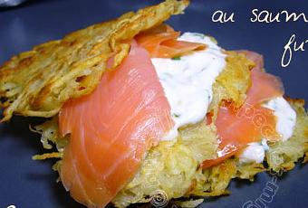 Râpez les pommes de terre, puis pressez les bien dans vos mains pour élimer le plus d’eau possible.Salez , poivrez. Faites chauffer l’huile dans une grande poêle et disposez dedans des petits tas de pommes de terre en les pressant bien avec le dos d’une spatule. Quand les bords sont bien dorés, retournez les et faites les cuire sur l’autre face, puis égouttez les sur du papier absorbant. Mélangez le fromage frais; les herbes et le jus de citron dans un récipient. Dans les assiettes, placez un rösti, du fromage, du saumon et recommencez l’opération. Servez aussitôt.