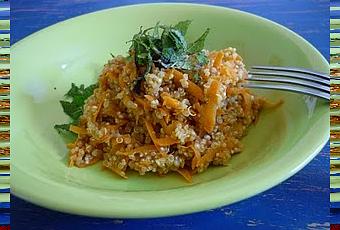 Quand le quinoa est pratiquement cuit (au bout de 10 min environ), ajouter directement dans le rice- cooker la carotte râpée, l’ail émincé, la pulpe de tomates, le lait de coco et les épices colombo.