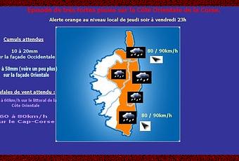 Une dégradation avec des pluies assez soutenues concerne la Corse depuis ce début de soirée. Venant de Sardaigne, ces pluies ont débutées par le Sud-Est de l'île depuis 20h, et commencent à se généraliser à toute la partie Est. Un vent d'Est à Sud-Est soufflera également assez fort en accompagnant ces pluies. Le Centre de la Corse et la Côte Orientale, seront les endroits les plus exposés par ces fortes pluies. La façade Occidentale étant plus à l'écart, mais pas épargné cependant... Notre rédaction a donc émis une alerte orange au niveau local pour cette dégradation. Cette alerte a prit effet ce soir à 21h, jusqu'à demain soir 23h. Voici notre bulletin de vigilance